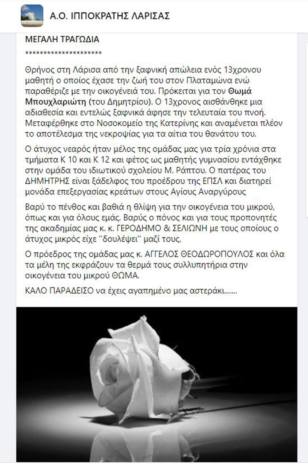 Σύμφωνα με πληροφορίες του onlarissa.gr, πρόκειται για τον μόλις 13 ετών Θωμά Μπουχλαριώτη -μαθητή τάξης του Γυμνασίου-, ο οποίος αναπάντεχα άφησε την τελευταία του πνοή. Ωστόσο, αν και μεταφέρθηκε εσπευσμένα στο Νοσοκομείο Κατερίνης, διαπιστώθηκε ο θάνατος του νεαρού αγοριού.
