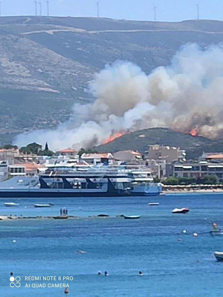 Η πυρκαγιά, σύμφωνα με την Πυροσβεστική, καίει δασική έκταση με πουρνάρια και πεύκα, νότια του χωριού, όπου υπάρχουν διάσπαρτα σπίτια, τα οποία δεν κινδυνεύουν από τη φωτιά, καθώς ο άνεμος φυσάει προς την αντίθετη κατεύθυνση.