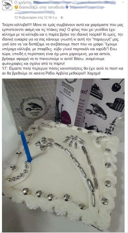 Τη φωτογραφία της τούρτας δημοσίευσε το ζαχαροπλαστείο, το οποίο βρήκε πρώτης τάξης ευκαιρία για να διαφημίσει τα κόλλυβά του.