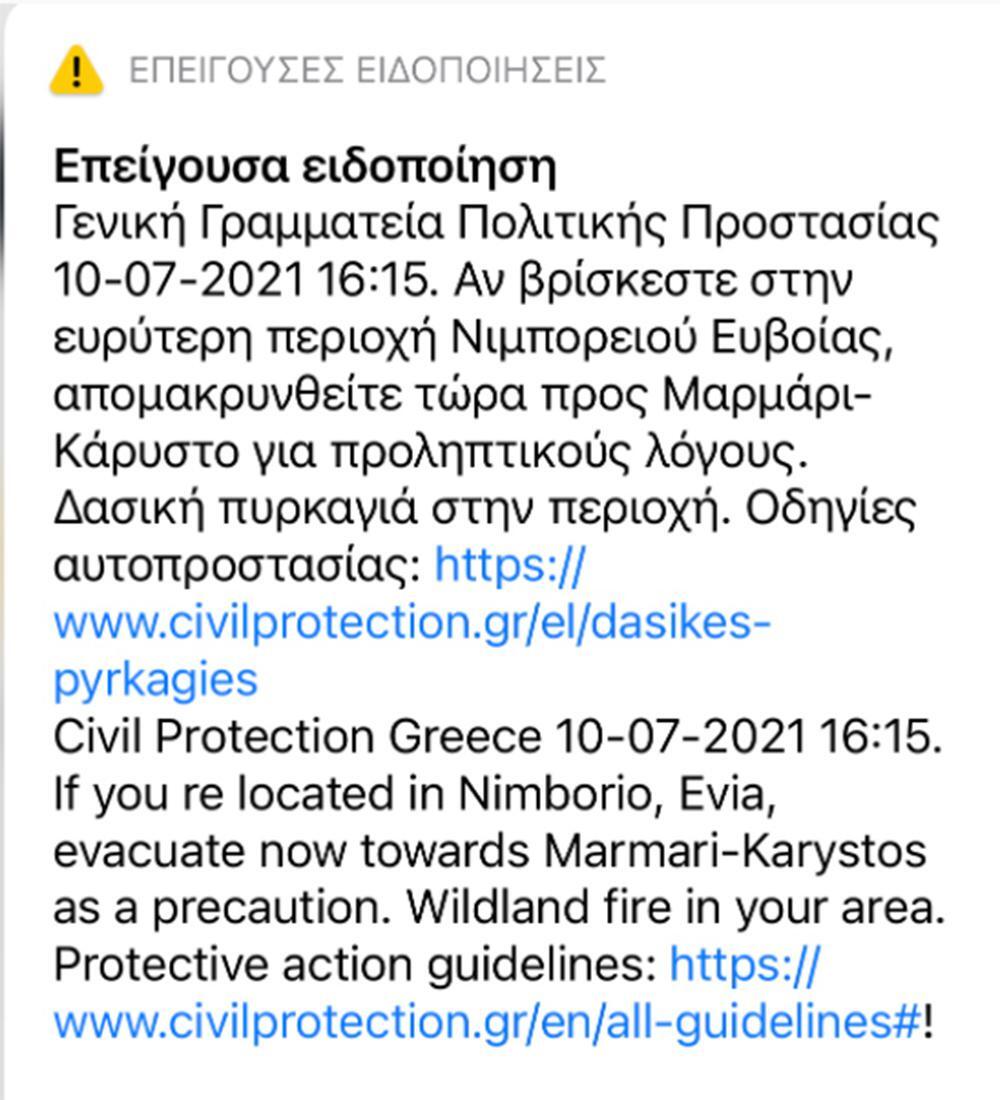 Εν τω μεταξύ, στις 16:15 εστάλη μήνυμα από το 112: «Αν βρίσκεστε στην ευρύτερη περιοχή Νημποριού Ευβοίας, απομακρυνθείτε τώρα προς Μαρμάρι – Κάρυστο για προληπτικούς λόγους. Δασική πυρκαγιά στην περιοχή».