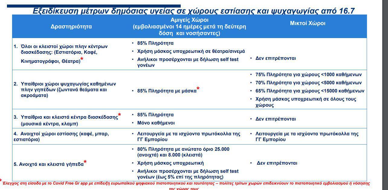 - Δυνατότητα λειτουργίας, κατ’ επιλογή της επιχείρησης, με την κατάλληλη σήμανση, με κοινό αμιγώς ανθρώπων που είτε έχουν εμβολιασθεί είτε έχουν νοσήσει