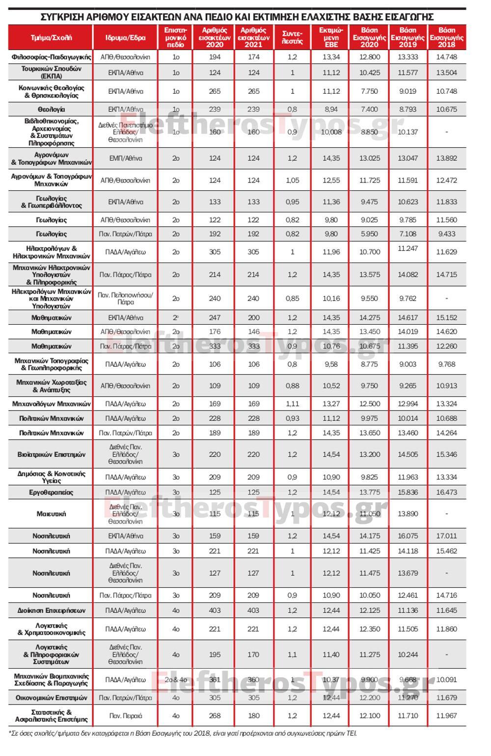 Ο Ελεύθερος Τύπος της Κυριακής παρουσιάζει 35 πανεπιστημιακά τμήματα ή σχολές που εδρεύουν στην Αθήνα, τη Θεσσαλονίκη και την Πάτρα, στα οποία η Ελάχιστη Βάση Εισαγωγής θα αφήσει εκτός πολλούς υποψηφίους και είναι πιθανόν παρά τη ζήτηση που έχουν τα τμήματα κεντρικών Ιδρυμάτων, να μην καλύψουν το σύνολο των θέσεων των εισακτέων τους, ανεβάζοντας παράλληλα τη βάση εισαγωγής τους λόγω της ΕΒΕ.