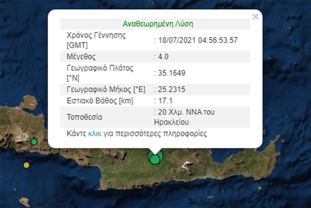 Ο σεισμός είχε επίκεντρο 21 χλμ νότια από το Ηράκλειο και εστιακό βάθος 17,1 χλμ σύμφωνα με το Γεωδυναμικό Ινστιτούτο.