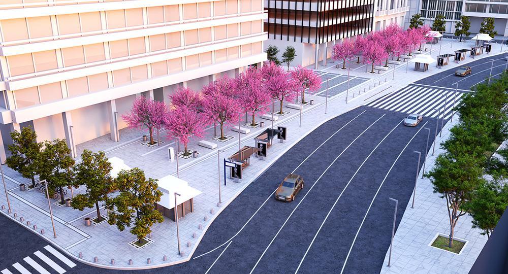 5. Η σύγχρονη διάβαση πεζών, πιο φιλική πια και στενότερη, δημιουργεί συνθήκες πρόσθετης οδικής ασφάλειας, διασυνδέει λειτουργικά τις ροές πεζών. Φωτιστικά στο δάπεδο της ασφάλτου, συγχρονισμένα με τους σηματοδότες, δημιουργούν αίσθηση πρόσθετης ασφαλείας, κυρίως τις βραδινές ώρες.