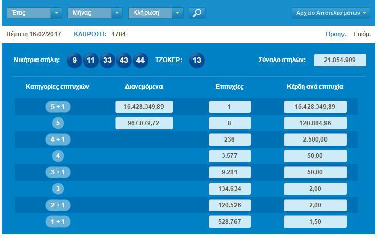 Το ποσό των 16,4 εκατ. προήλθε μετά από 16 συνεχόμενα τζακ ποτ στην πρώτη κατηγορία (5 +1). Το σερί των τζακποτ ξεκίνησε στις 22 Δεκεμβρίου του 2016.