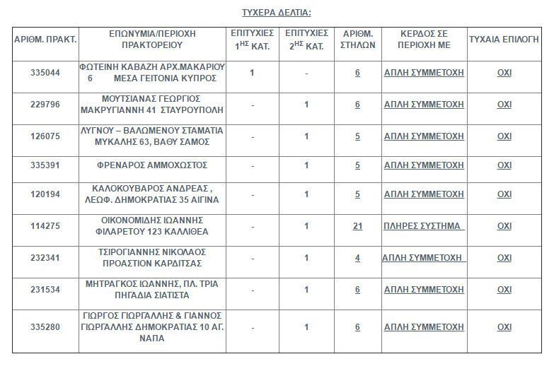 Σύμφωνα με τα στοιχεία, η Κύπρος είχε την τιμητική της, καθώς εκτός από το μοναδικό δελτίο στις 5+1 επιτυχίες, είχε άλλα δύο κερδισμένα δελτία στις 5 επιτυχίες που έδιναν 120.000 ευρώ σε κάθε νικητή, ένα δελτίο συμπληρωμένο στην Αμμόχωστο και άλλο ένα στην Αγία Νάπα.