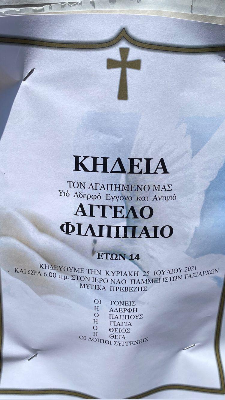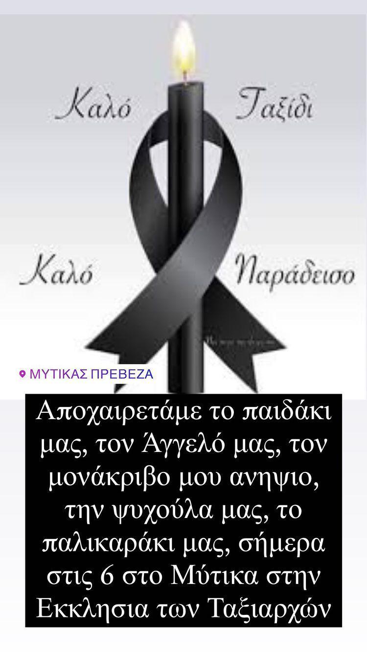 «Αποχαιρετάμε το παιδάκι μας, τον Άγγελο μας, τον μονάκριβό μου ανιψιό, την ψυχούλα μας, το παλικάρι μας, σήμερα στις 6 στο Μύτικα στην Εκκλησία των Ταξιαρχών» έγραψε η δημοσιογράφος.