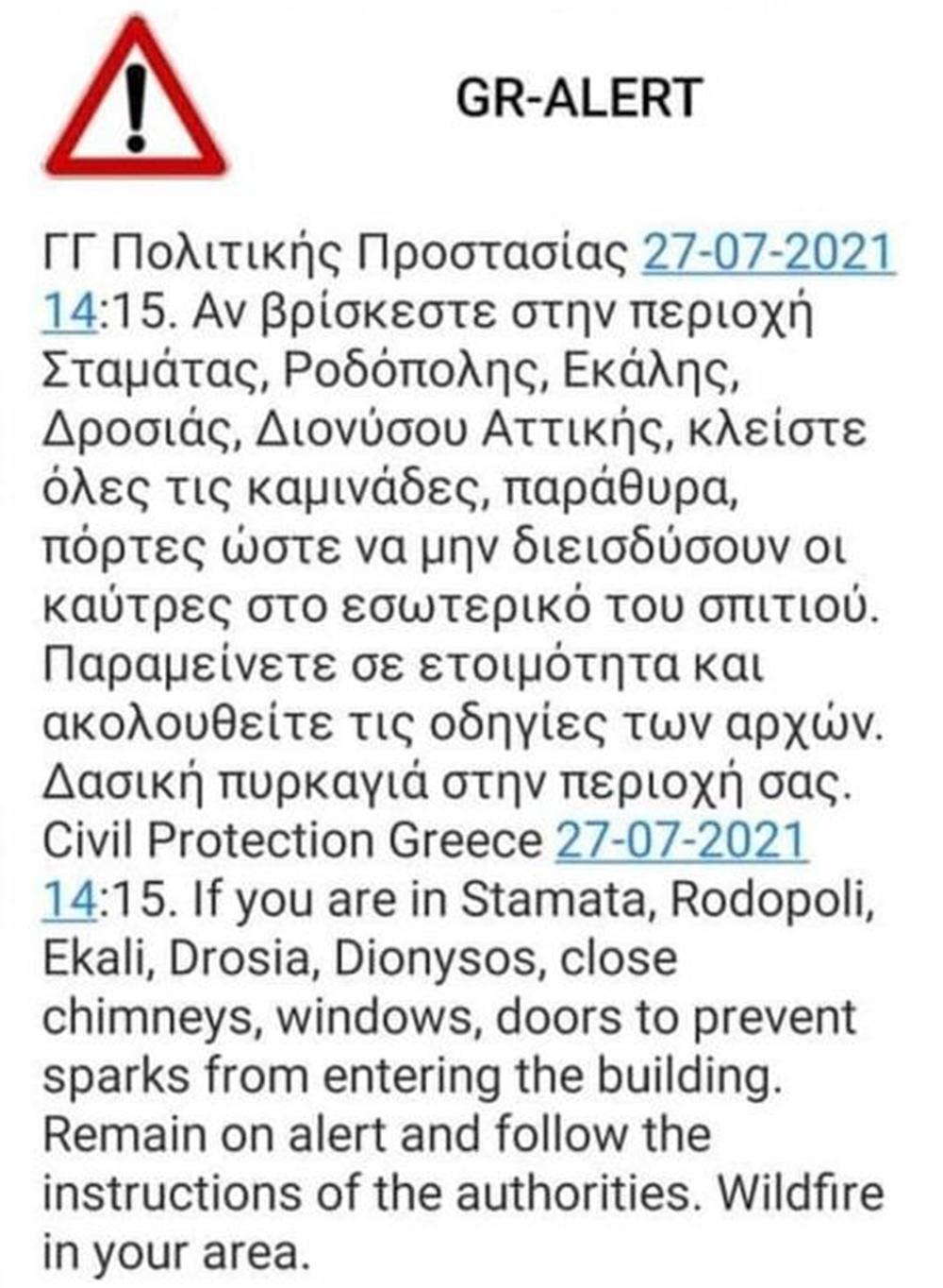 «Αν βρίσκεστε στην περιοχή Σταμάτας, Ροδόπολης, Εκάλης, Δροσιάς και Διονύσου Αττικής κλείστε καμινάδες, παράθυρα, πόρτες ώστε να μην διεισδύσουν οι καύτρες στο εσωτερικό του σπιτιού. Παραμείνετε σε ετοιμότητα και ακολουθείτε τις οδηγίες των αρχών. Δασική πυρκαγιά στην περιοχή σας», αναφέρει η ειδοποίηση της ΓΓΠΠ.