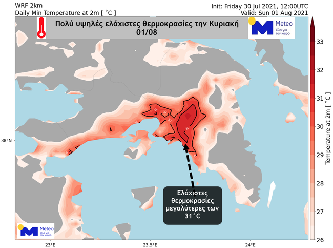 Στον προγνωστικό χάρτη που ακολουθεί αποτυπώνονται οι ελάχιστες θερμοκρασίες για την Κυριακή 01/08, με τη θερμοκρασία εντός του αστικού ιστού της Αθήνας να διατηρείται στα επίπεδα των 30-32 βαθμών Κελσίου.