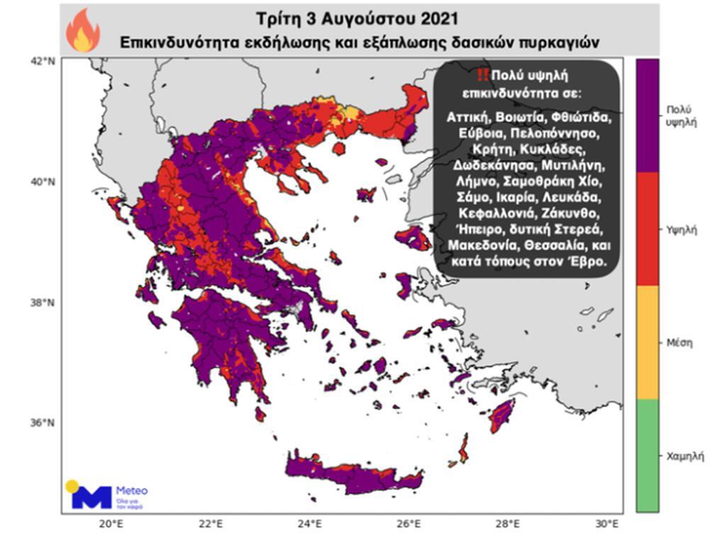 Με βάση τον καναδικό πυρομετεωρολογικό δείκτη που υπολογίζει επιχειρησιακά το Εθνικό Αστεροσκοπείο Αθηνών/meteo.gr, πολύ υψηλή επικινδυνότητα αναμένεται σήμερα σε Αττική, Βοιωτία, Φθιώτιδα, Εύβοια, Πελοπόννησο, Κρήτη, Κυκλάδες, Δωδεκάνησα, Μυτιλήνη, Λήμνο, Σαμοθράκη, Χίο, Σάμο, Ικαρία, Λευκάδα, Κεφαλλονιά, Ζάκυνθο, Ήπειρο, Δυτική Στερεά, Μακεδονία, Θεσσαλία και κατά τόπους στον Έβρο.