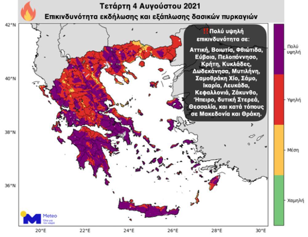 Η Τετάρτη 4 Αυγούστου αναμένεται εξίσου επικίνδυνη, με υψηλή επικινδυνότητα πρκαγιών στο μεγαλύτερο τμήμα της χώρας και ειδικότερα σε: Αττική, Βοιωτία, Φθιώτιδα, Εύβοια, Πελοπόννησο, Κρήτη, Κυκλάδες, Δωδεκάνησα, Μυτιλήνη, Σαμοθράκη, Χίο, Σάμο, Ικαρία, Λευκάδα, Κεφαλλονιά, Ζάκυνθο, Ήπειρο, Δυτική Στερεά, Θεσσαλία και κατά τόπους σε Μακεδονία και Θράκη.