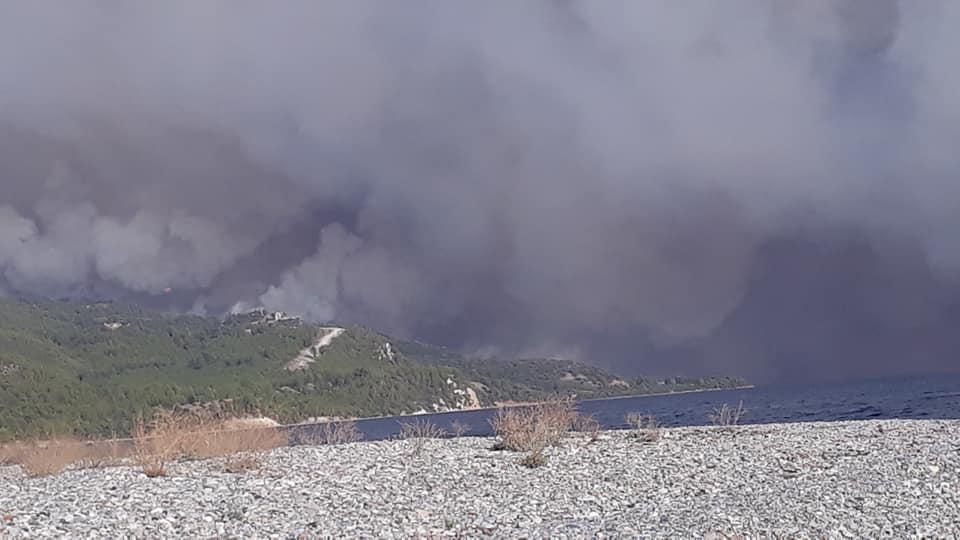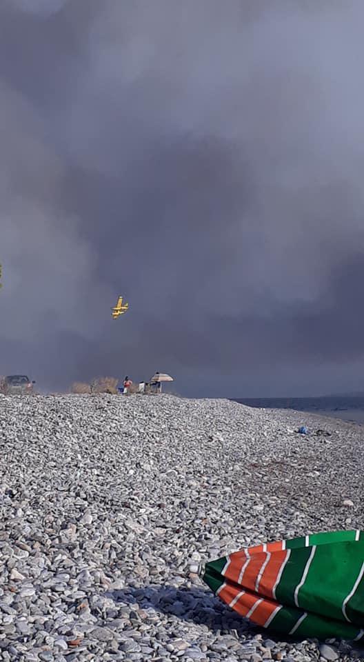 Η πυρκαγιά έχει σημάνει συναγερμό στις Αρχές, ιδιαίτερα για τους οικισμούς που βρίσκονται στην παραλιακή ζώνη, στον δρόμο από τη Λίμνη έως τις Ροβιές.