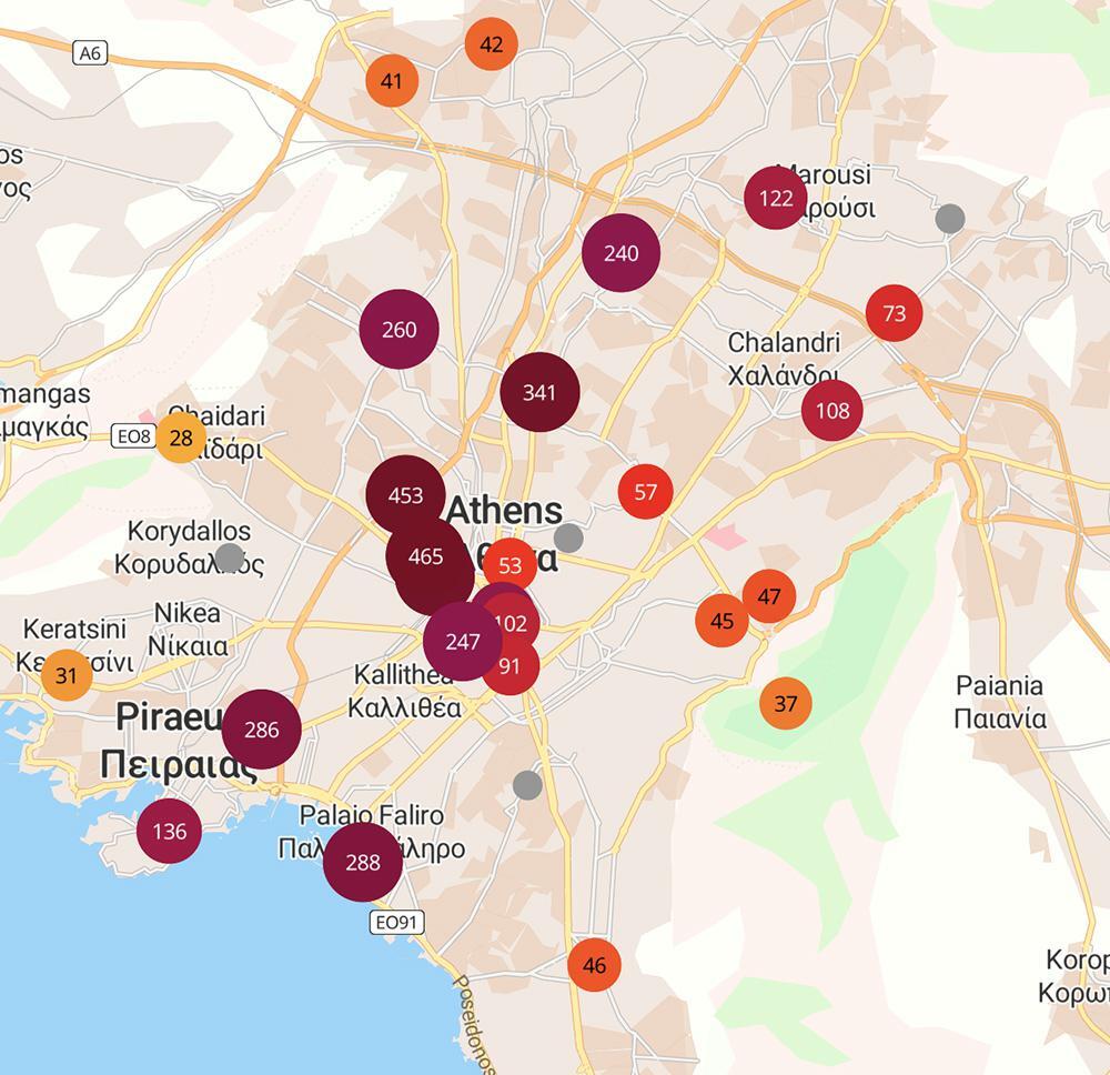 Από την Ευρωπαϊκή πλατφόρμα μετρήσεων ποιότητας αέρα PurpleAir: Real-time Air Quality Monitoring που στηρίζεται στην νέα γενιά αισθητήρων «Internet of Things». Οι μονάδες είναι σε μικρογραμμάρια ανά κυβικό μέτρο. Οι τιμές που εμφανίζονται είναι αβαθμονόμητες και πρέπει να διαιρεθούν με έναν παράγοντα 1.8 περίπου.