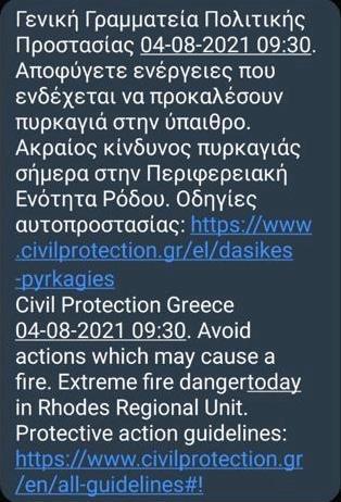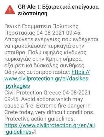 Λίγο πριν τις 10:00 οι πολίτες έλαβαν μήνυμα alert από την Πολιτική Προστασία στα κινητά τηλέφωνά τους. Μέσω του μηνύματος καλούνται να αποφύγουν ενέργειες που ενδέχεται να προκαλέσουν πυρκαγιά στην ύπαιθρο, ενώ παράλληλα γίνεται αναφορά για εξαιρετικά δύσκολες συνθήκες στο νησί.