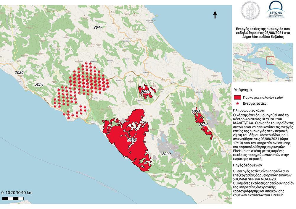 Όπως σημειώνει το Αστεροσκοπείο, οι ενεργές εστίες της πυρκαγιάς στην περιοχή Λίμνης Ευβοίας είναι αποτέλεσμα επεξεργασίας δορυφορικών εικόνων SUOMMI NPP και ΝΟΑΑ-20 που λαμβάνει καθημερινά στις κεραίες του, ενώ οι καμένες εκτάσεις αποτελούν προϊόν της υπηρεσίας διαχρονικής χαρτογράφησης και απεικόνισης καμένων εκτάσεων του FireHub.