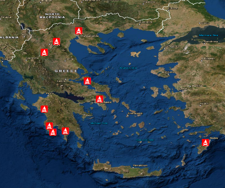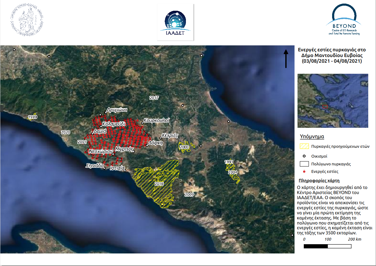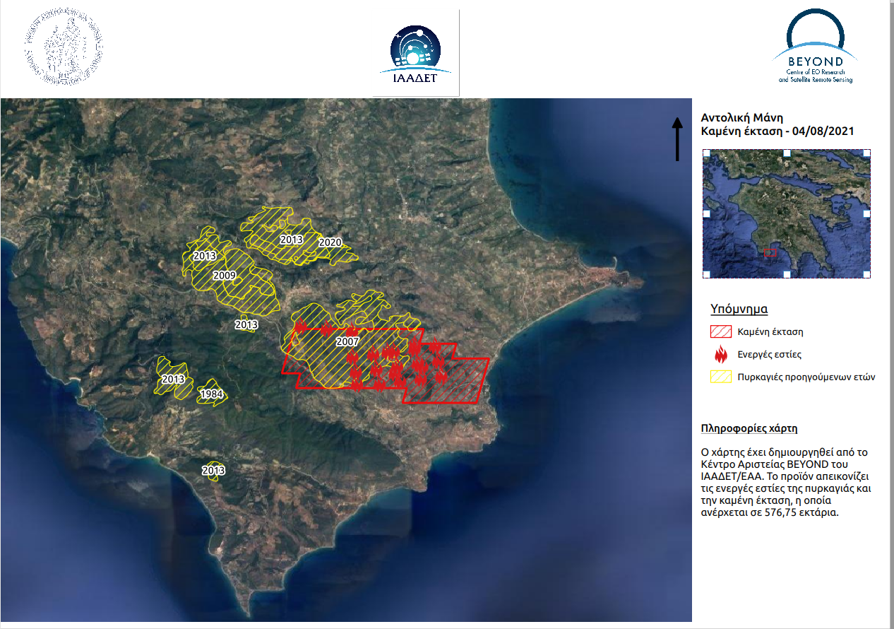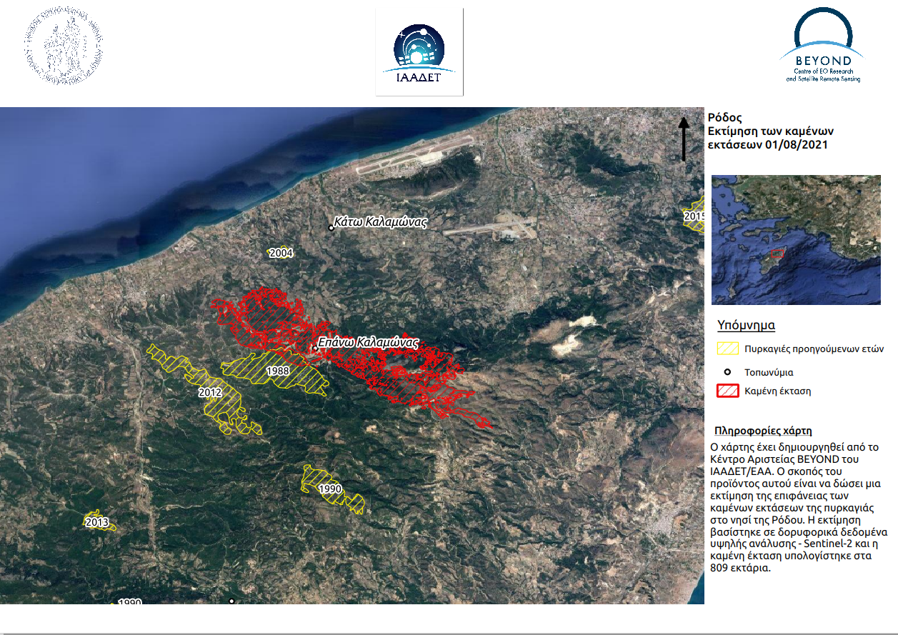 Ο αρχικός υπολογισμός των καμένων εκτάσεων των πυρκαγιών στη Ρόδο (1/8/2021), στην Αττική (3/8/2021), στην Εύβοια (3/8/2021) και στην Ανατολική Μάνη (3/8/2021) ανέρχεται στα περίπου 6.000 εκτάρια (60.000 στρέμματα).