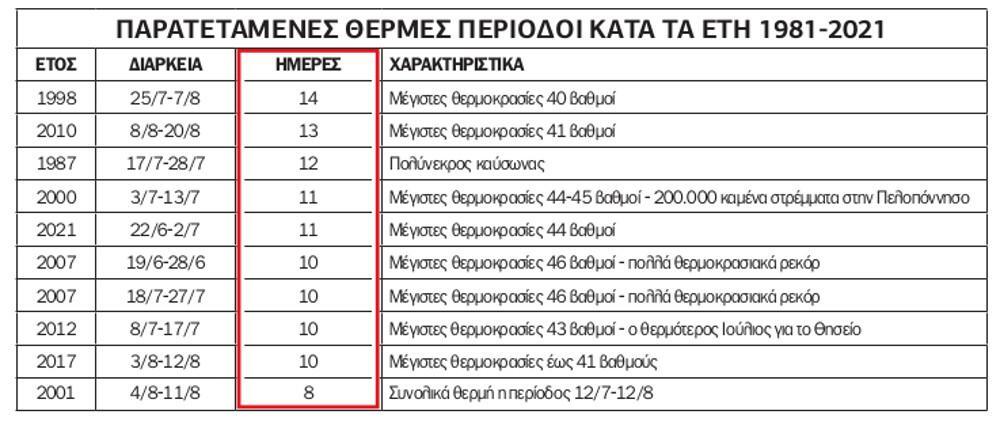 Οπως προκύπτει από τον πίνακα, η συντριπτική πλειονότητα των περιπτώσεων έχει εκδηλωθεί μετά το 2000. Ετσι, ενώ στα τέλη του 20ού αιώνα ο πολυήμερος καύσωνας ήταν ένα φαινόμενο που έπληττε τη χώρα μας με ρυθμό περίπου ένα περιστατικό κάθε δεκαετία, τα πρώτα 20 χρόνια του 21ου αιώνα επαναλαμβάνεται πολύ πιο τακτικά, ενώ δύο χρονιές (2007 και φέτος) σημειώθηκαν δύο επεισόδια μακρόσυρτης θερμικής εισβολής μέσα στο ίδιο έτος.