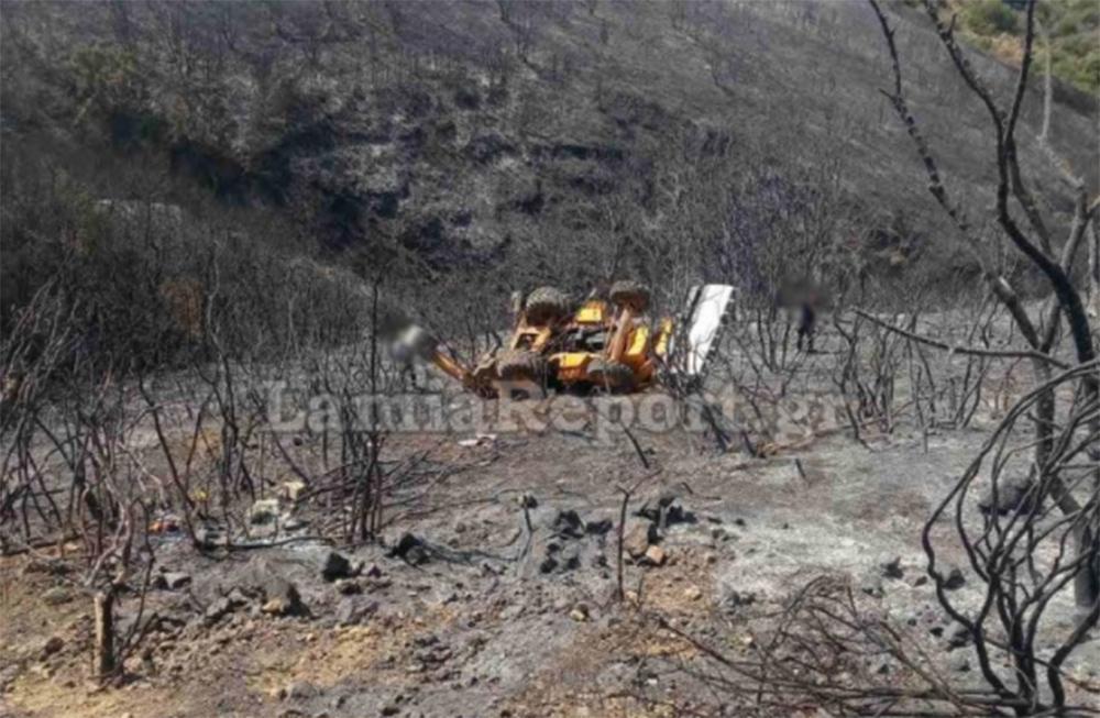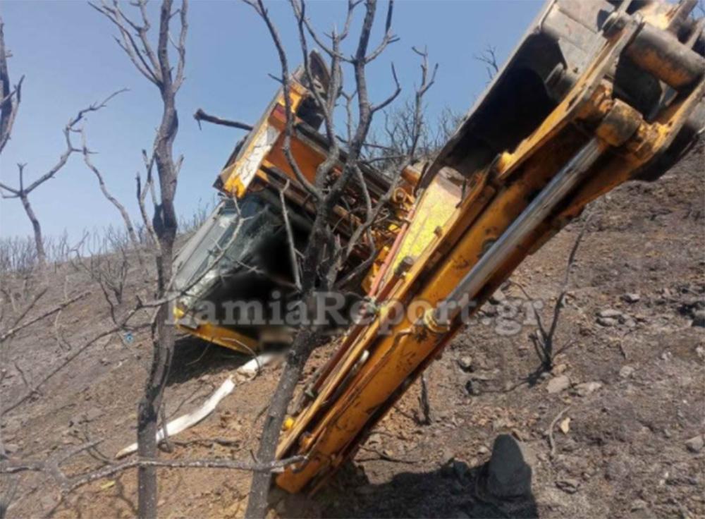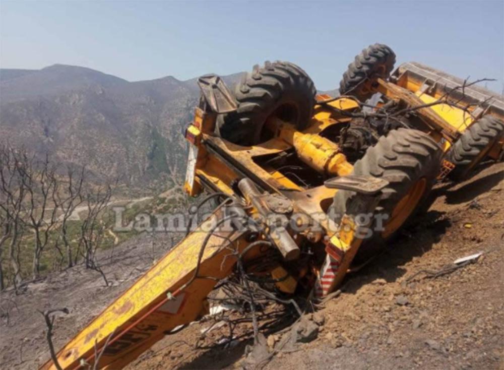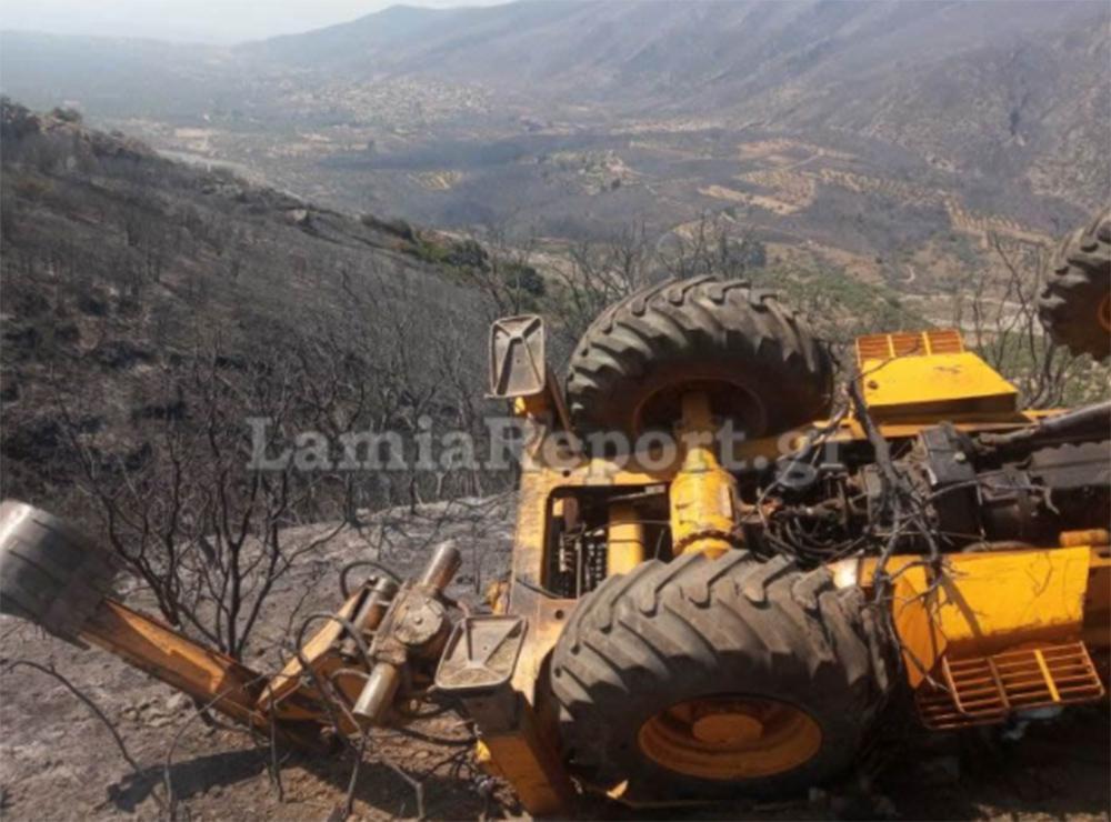 Η μπουλντόζα μετά την εκτροπή τούμπαρε και σταμάτησε όπως το βλέπετε στις φωτογραφίες του LamiaReport στη μέση της πλαγιάς, μετά από τριάντα μέτρα περίπου.