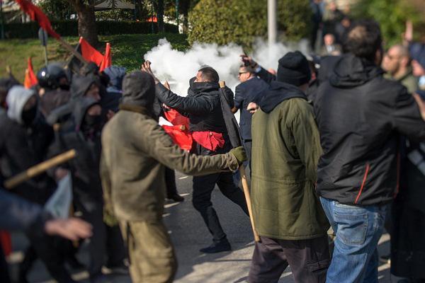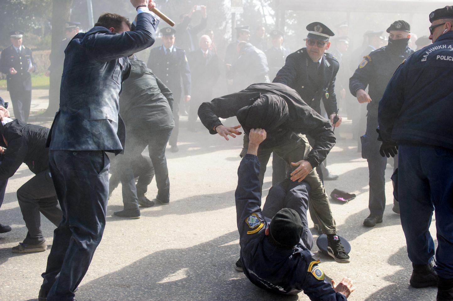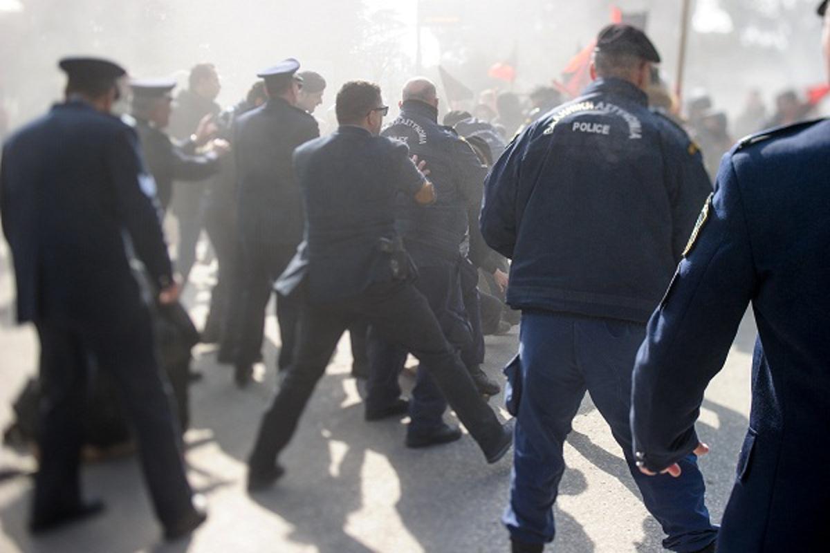 ‘Οταν οι αστυνομικοί επιχείρησαν να τους απομακρύνουν σημειώθηκε συμπλοκή και οι αντιεξουσιαστές επιτέθηκαν με τα κοντάρια από τις σημαίες που κρατούσαν, ενώ, σύμφωνα με πληροφορίες, τουλάχιστον δύο αστυνομικοί έχουν χτυπήσει στο κεφάλι. Η αστυνομία έχει προχωρήσει σε τέσσερις προσαγωγές.