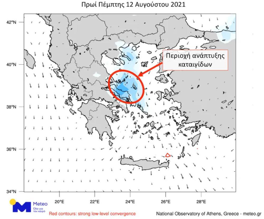 Ο χάρτης δείχνει με γαλάζιο χρώμα τις περιοχές με ευνοϊκές συνθήκες για την ανάπτυξη καταιγίδων το πρωί της Πέμπτης 12/08. Συνιστάται ιδιαίτερη προσοχή στις πληγείσες περιοχές από τις καταστροφικές πυρκαγιές των προηγούμενων ημερών στην Εύβοια, καθώς οι αργά κινούμενες καταιγίδες μπορεί να προκαλέσουν τοπικά προβλήματα. Βελτίωση των καιρικών συνθηκών προβλέπεται το μεσημέρι της Πέμπτης 12/08.