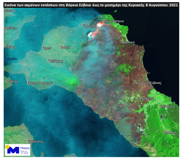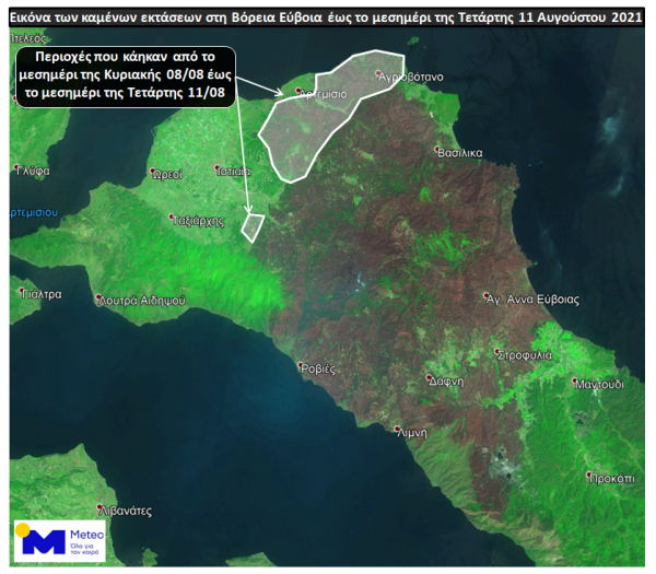 Με βάση τις εικόνες αυτές και σύμφωνα με τους υπολογισμούς του Εθνικού Αστεροσκοπείου Αθηνών / meteo.gr, οι καμένες εκτάσεις την Κυριακή 08/08 ήταν περίπου 460.000 στρέμματα, ενώ την Τετάρτη 11/08 510.000 στρέμματα.