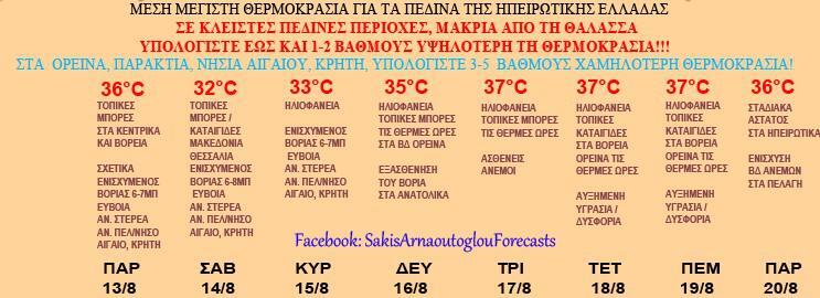 Όπως αναφέρει ο Σάκης Αρναούτογλου στο Facebook: «Σε γενικές γραμμές μικρή περαιτέρω πτώση της θερμοκρασίας το ερχόμενο Σαββατοκύριακο, νέα σταδιακή αλλά “συγκρατημένη” άνοδος αυτής την ερχόμενη εβδομάδα με σχετικά όμως αυξημένη την σχετική υγρασία και τη δυσφορία κατά τόπους κυρίως την Τετάρτη και την Πέμπτη».