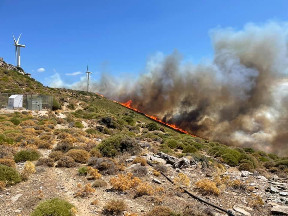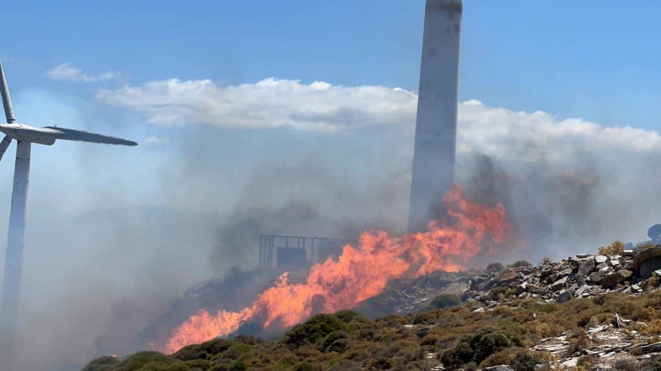Σημειώνεται ότι η φωτιά έχει ξεσπάσει σε περιοχή με εγκατεστημένες ανεμογεννήτριες.