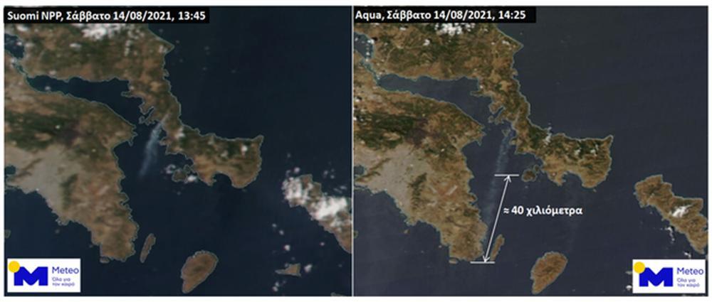 Οι περιβαλλοντικοί δορυφόροι Suomi NPP και Aqua, χάρη στις ανέφελες συνθήκες που επικράτησαν το μεσημέρι στην περιοχή, κατέγραψαν εικόνες στις οποίες φαίνεται καθαρά η πορεία του καπνού. Τις εικόνες αυτές μελέτησαν στο Εθνικό Αστεροσκοπείο Αθηνών / meteo.gr.