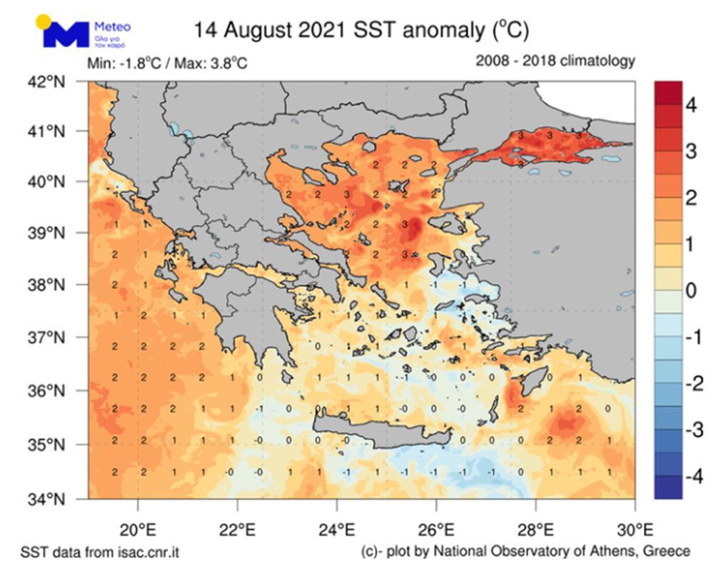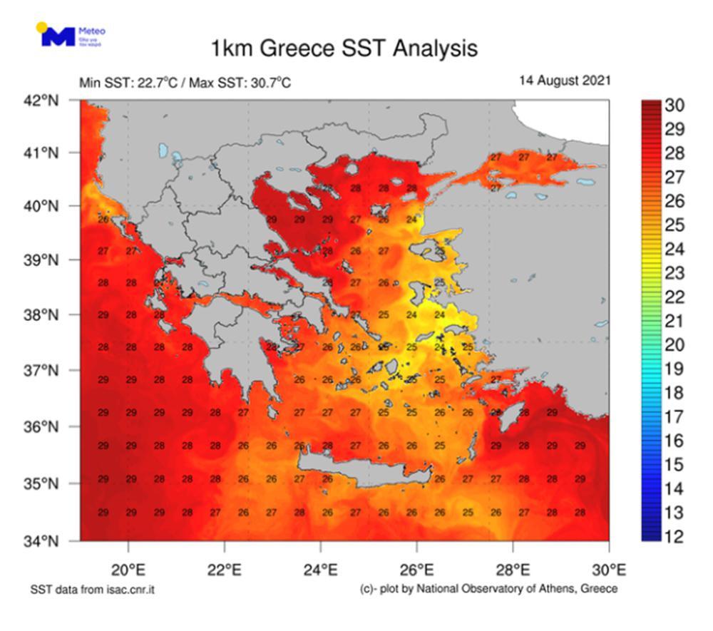 Ειδικότερα, στο Βόρειο Αιγαίο η θερμοκρασία της επιφάνειας της θάλασσας κυμαίνεται από 2 έως 4 βαθμούς υψηλότερα από τον μέσο όρο της περιόδου 2008-2018, με τις δορυφορικές μετρήσεις να δείχνουν απόλυτες τιμές της τάξης των 29-30°C. Παρόμοιες τιμές θερμοκρασίας παρατηρούνται ανοιχτά του Ιονίου Πελάγους και νοτίως της Ρόδου.