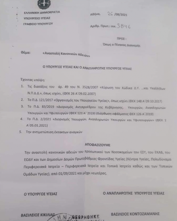 Όπως αναφέρεται σε σχετικό έγγραφο που υπογράφει ο αναπληρωτής υπουργός Υγείας, Βασίλης Κοντοζαμάνης, η απόφαση αφορά τους γιατρούς, νοσηλευτές και λοιπό προσωπικό σε νοσηλευτικές δομές αλλά και δομές της Πρωτοβάθμιας Φροντίδας Υγείας, όπως είναι σε Κέντρα Υγείας, Πολυδύναμα Περιφερειακά Ιατρεία, Τοπικά Ιατρεία και Ομάδες Υγείας. Η απόφαση έχει ισχύ από την 1η Σεπτεμβρίου μέχρι νεωτέρας.