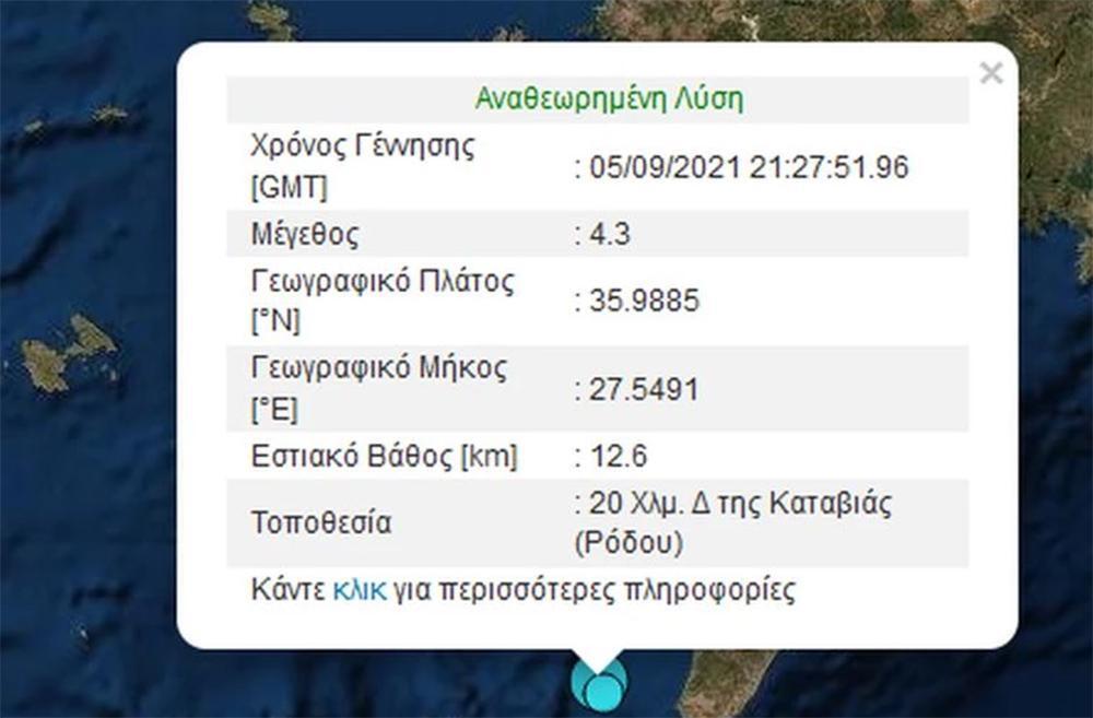 Ο σεισμός έγινε σε απόσταση 404 χλμ. ανατολικά/νοτιοανατολικά των Αθηνών και το επίκεντρο εντοπίζεται στον θαλάσσιο χώρο 21 χλμ. δυτικά/βορειοδυτικά της πόλης της Καταβιάς (Ρόδου).