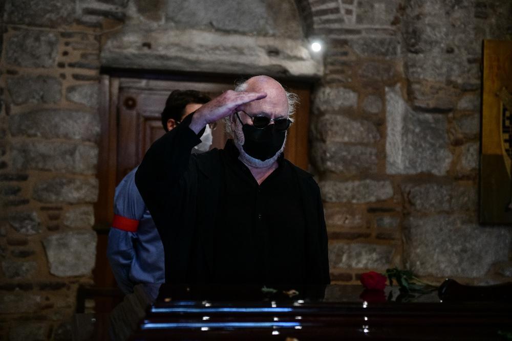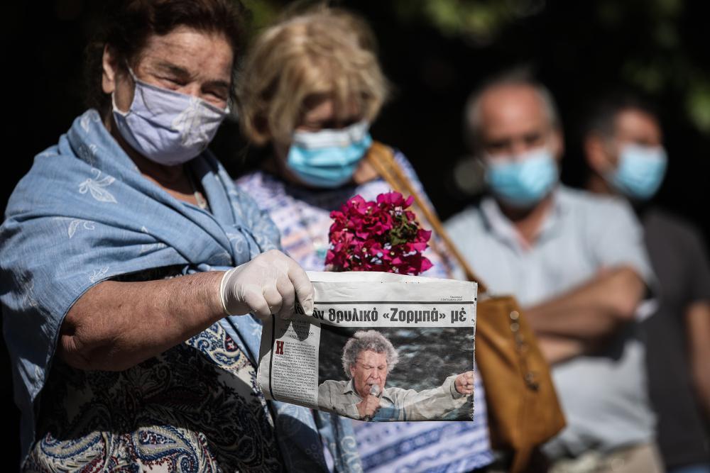Πλήθος κόσμου περίμενε υπομονετικά στη μεγάλη ουρά που είχε σχηματιστεί από το πρωί στο πεζοδρόμιο επί της οδού Μητροπόλεως για το «τελευταίο αντίο» στον κορυφαίο μουσικοσυνθέτη και πολιτικό. Με ένα λουλούδι στο χέρι, συνήθως κόκκινο τριαντάφυλλο ή γαρύφαλλο, και τηρώντας όλα τα μέτρα κατά του κορονοϊού, άνθρωποι όλων των ηλικιών παρέμεναν ήσυχοι έως ότου έρθει η σειρά τους για να αποχαιρετίσουν τον μεγάλο δημιουργό.