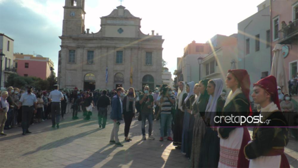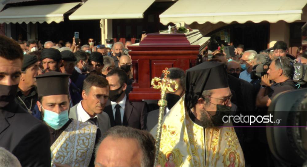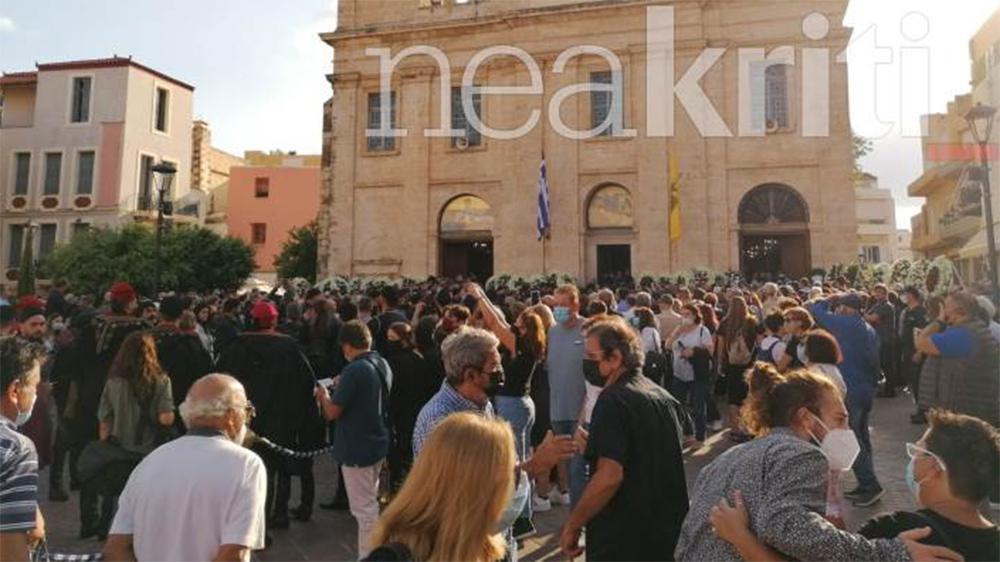 Την στιγμή που η σορός έφτασε στον ναό, υπό τους ήχους της φιλαρμονικής του δήμου, οι συγκεντρωμένοι πολίτες ξέσπασαν σε χειροκροτήματα και φώναζαν «αθάνατος». Στον χώρο μπροστά από τον ναό είχαν παραταχθεί -φορώντας παραδοσιακές στολές της Κρήτης- μέλη πολιτιστικών και παραδοσιακών συλλόγων, ενώ κατά την πορεία προς τον ναό φοιτητές τραγουδούσαν τραγούδια του Μίκη Θεοδωράκη. Η είσοδος στον ναό, παρά τον πολύ κόσμο, γίνεται με τάξη και με τήρηση των μέτρων κατά της πανδημίας.