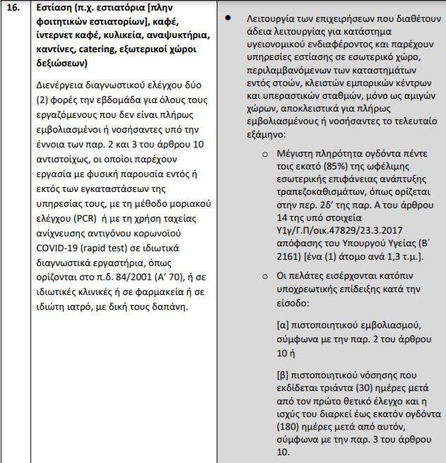 Θυμίζουμε ότι καταστήματα εστίασης, καφέ και ίντερνετ καφέ θα αποτελούν αμιγείς χώρους μόνο για πλήρως εμβολιασμένους. Θα έχουν χωρητικότητα 85%, ενώ οι πελάτες θα εισέρχονται με πιστοποιητικό εμβολιασμού ή νόσησης.
