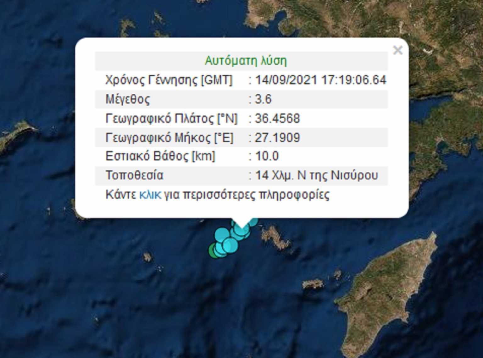 Σύμφωνα με το Γεωδυναμικό Ινστιτούτο το επίκεντρο του σεισμού εντοπίζεται 14 χιλιόμετρα νότια της Νισύρου, ενώ το εστιακό βάθος υπολογίζεται στα 10 χιλιόμετρα.