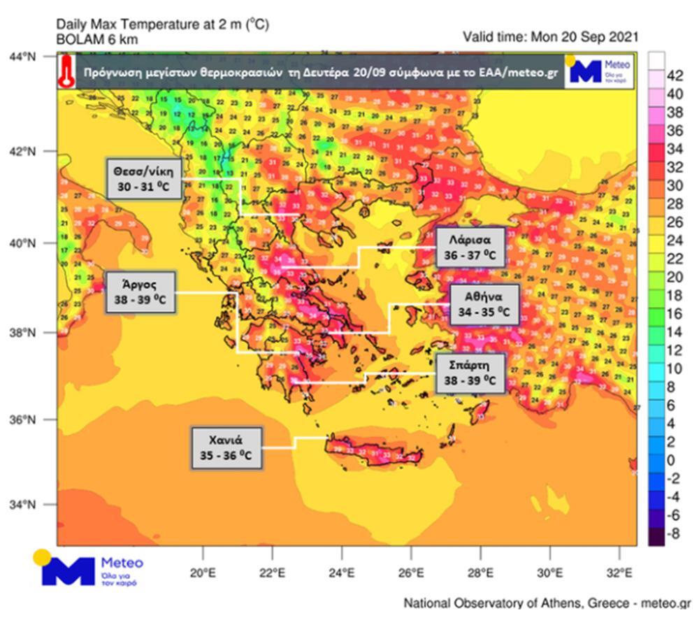 Για τη σήμερα, Δευτέρα, πολύ υψηλές θερμοκρασίες προβλέπονται κυρίως στα κεντρικά και νότια τμήματα της χώρας, με τις μέγιστες να φτάνουν τους 36-38 και τοπικά τους 39 βαθμούς Κελσίου. Στην Αθήνα αναμένονται θερμοκρασίες έως 34-35 βαθμούς, στα Χανιά 35-36, στη Λάρισα 36-37, ενώ στο Άργος και τη Σπάρτη 38-39 βαθμούς.