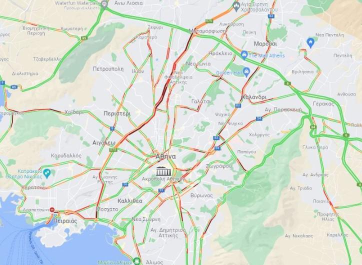 Αποτέλεσμα είναι λίγο πριν τις 8 το πρωί η κίνηση στην κάθοδο του Κηφισού να ξεκινά πριν τον κόμβο της Μεταμόρφωσης και κατά τμήματα να συνεχίζεται μέχρι την παραλιακή λεωφόρο Ποσειδώνος όπως φαίνεται στον χάρτη της Google με την κίνηση στους δρόμους της Αθήνας.