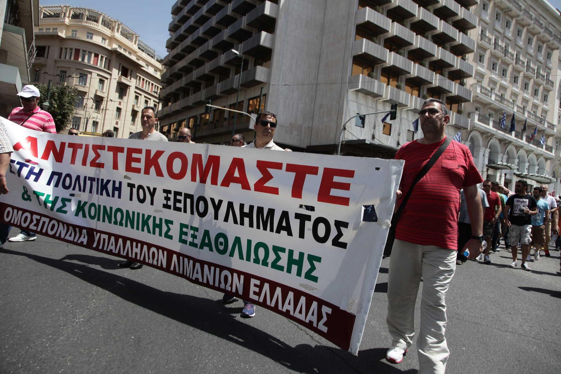 Οι εργαζομένοι στα λιμάνια του ΟΛΠ και του ΟΛΘ ξεκίνησαν την πορεία τους από την πλατεία Κλαυθμώνος φωνάζοντας συνθήματα όπως «Τσίπρας σημαίνει Ελλάδα πουλημένη» και «πουλάτε, πουλάτε, το ξύλο θα το φάτε». Λίγο μετά τις 12 αφού δεν τους επετράπη η παρέμβαση στη συνέλευση των μετόχων του ΟΛΠ, οι λιμενεργάτες κατευθύνθηκαν έξω από το υπουργείο Οικονομικών ζητώντας να συναντηθούν με τον Ευκλείδη Τσακαλώτο.