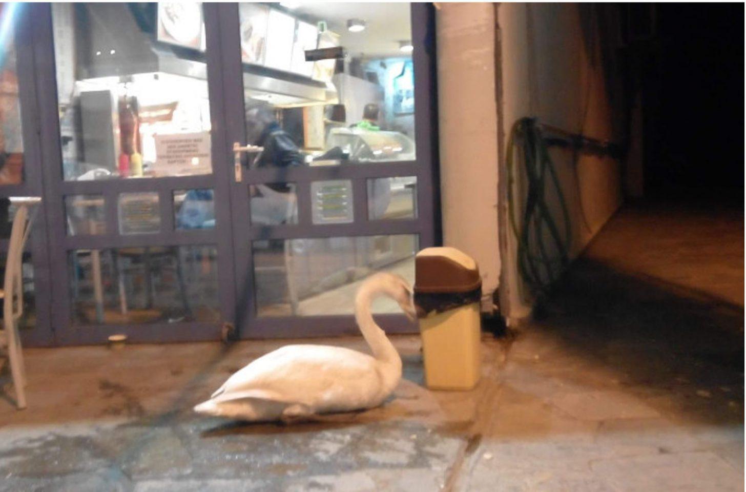 Από τις φωτογραφίες φαίνεται πως ο κύκνος πείνασε και είπα να… «δοκιμάσει» τα αποφάγια που είχαν αφήσει οι θαμώνες τους καταστήματος.