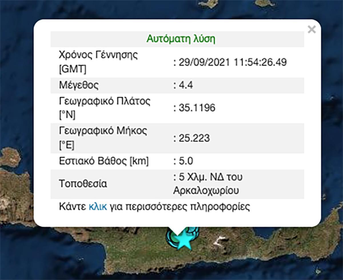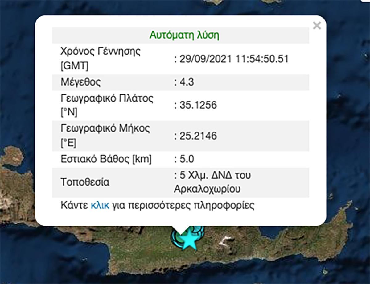 Ο δεύτερος σεισμός έγινε δευτερόλεπτα αργότερα, είχε ένταση 4,3 Ρίχτερ, 5 χιλιόμετρα εστιακό βάθος και επίκεντρο 5 χιλιόμετρα δυτικά νοτιοδυτικά του Αρκαλοχωρίου.