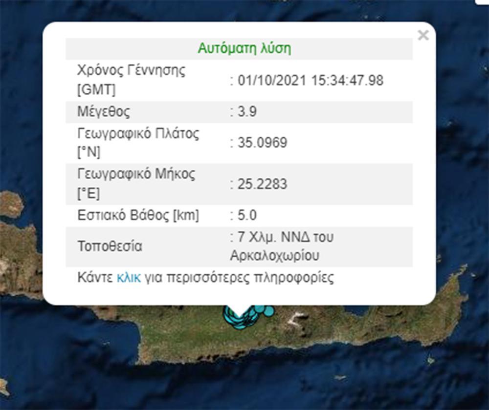 Σύμφωνα με το Γεωδυναμικό Ινστιτούτο το επίκεντρο του σεισμού εντοπίζεται 7 χιλιόμετρα νότια νοτιοδυτικά του Αρκαλοχωρίου, με εστιακό βάθος στα 5 χιλιόμετρα.
