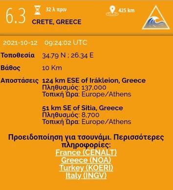 Ο σεισμός, που έχει επίκεντρο στη θάλασσα ανοιχτά της Ιεράπετρας στο Λιβυκό Πέλαγος, ήταν μεγέθους 6,3 Ρίχτερ σύμφωνα με την αυτόματη λύση του Γεωδυναμικού Ινστιτούτου Αθηνών και είχε εστιακό βάθος 10 χιλιόμετρα.