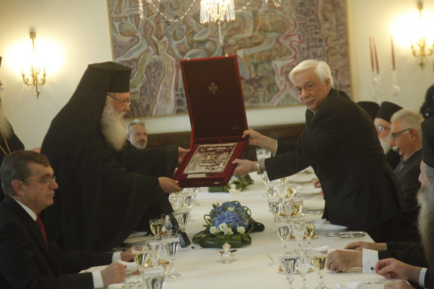 Έχοντες πείραν της ευσέβειας που Σας διακρίνει, ευχόμεθα ακλόνητη υγεία παρά Θεού, εύδρομη συνέχεια και ακμαιότητα δυνάμεων στο βαρυσήμαντο έργο Σας. Εις ένδειξιν ευχαριστίας για τη σημερινή πρόσκληση, επιτρέψτε μου, κύριε Πρόεδρε, να Σας προσφέρω την ιερή εικόνα του Αποστόλου Παύλου εν μέσω του Αρείου Πάγου, στην ιστορική εκείνη συνάντηση που γεφύρωσε την απόσταση που χώριζε τον αρχαίο κόσμο από τη χριστιανική σοφία».