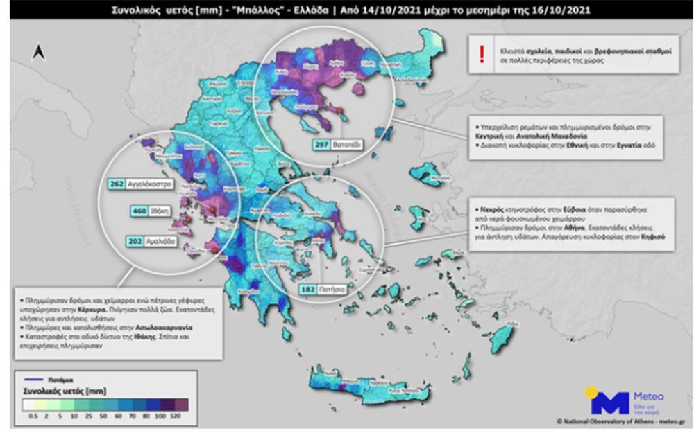 Σύμφωνα με το meteo.gr κατεγράφησαν μεγάλα ύψη βροχής από την Πέμπτη έως και το πρωί του Σαββάτου. Όπως προκύπτει από τις καταγραφές ο μεγαλύτερος όγκος νερού έπεσε στην Ιθάκη (460 χιλιοστά) και ακολούθησαν η Ι.Μ. Βατοπεδίου στο Άγιον Όρος (297 χιλιοστά) και στο Αγγελόκαστρο Αιτωλοακαρνανίας (262 χιλιοστά). Μεγάλα ύψη βροχής καταγράφηκαν και στην Αθήνα όπου ο σταθμός των Πατησίων κατέγραψε 182 χιλιοστά βροχής.