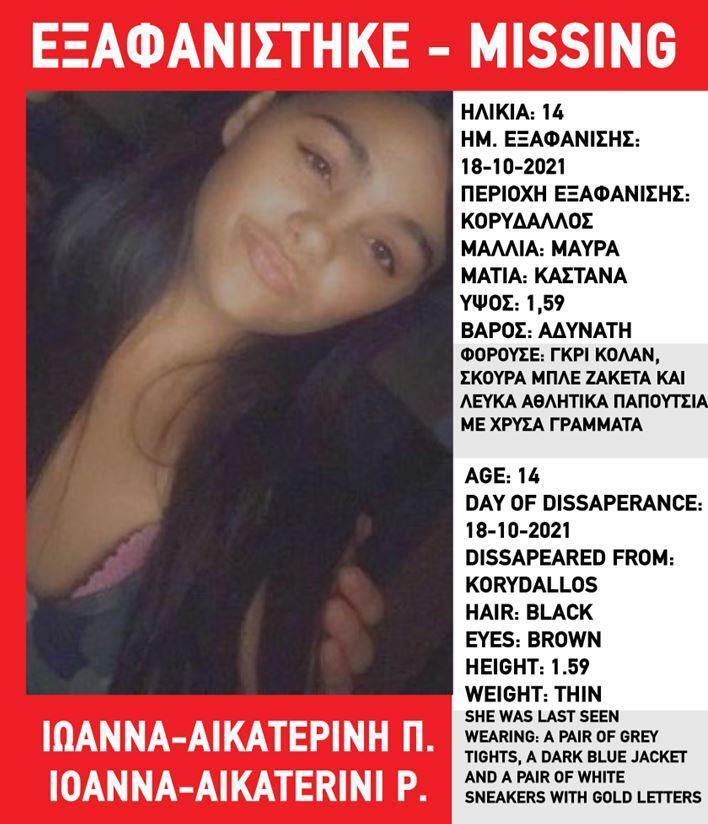 Η Ιωάννα-Αικατερίνη Π.,14 ετών εξαφανίστηκε στις 18/10/2021 και ώρα 19:00, από την περιοχή του Κορυδαλλού.