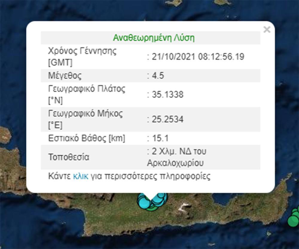 Σημειώνεται ότι είχε προηγηθεί σεισμική δόνηση 3,7 Ρίχτερ, στις 11:04, δύο χιλιόμετρα νοτιοδυτικά του Αρκαλοχωρίου στην Κρήτη με εστιακό βάθος 15,6 χιλιομέτρων.