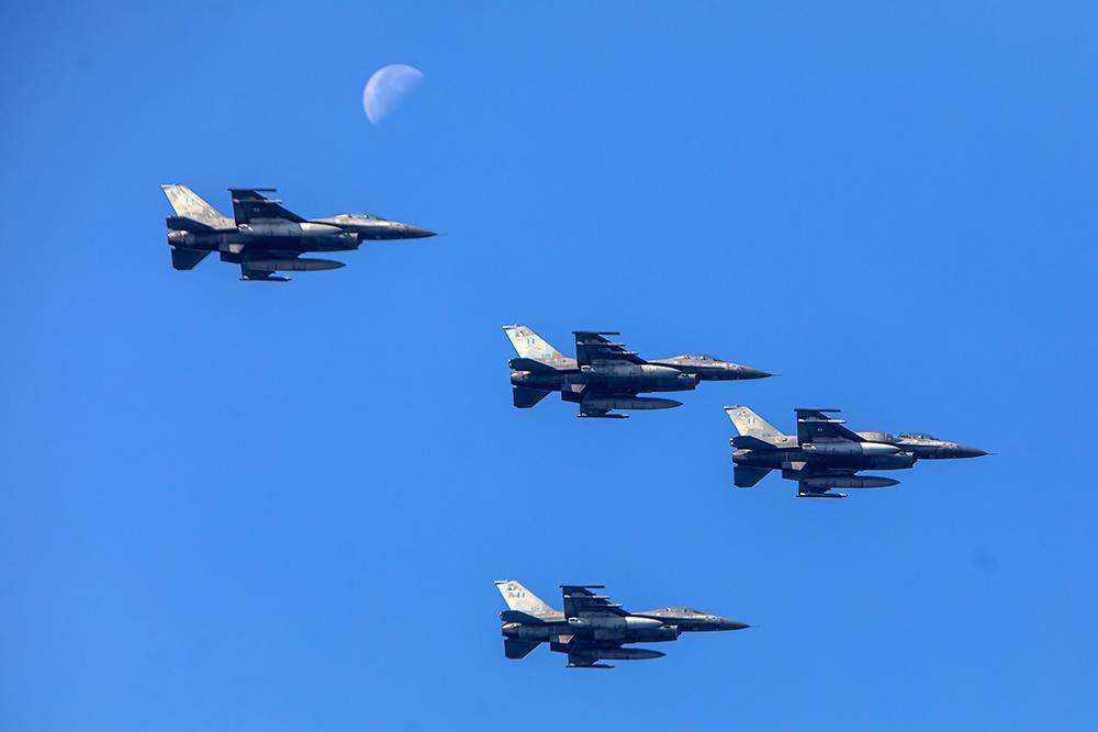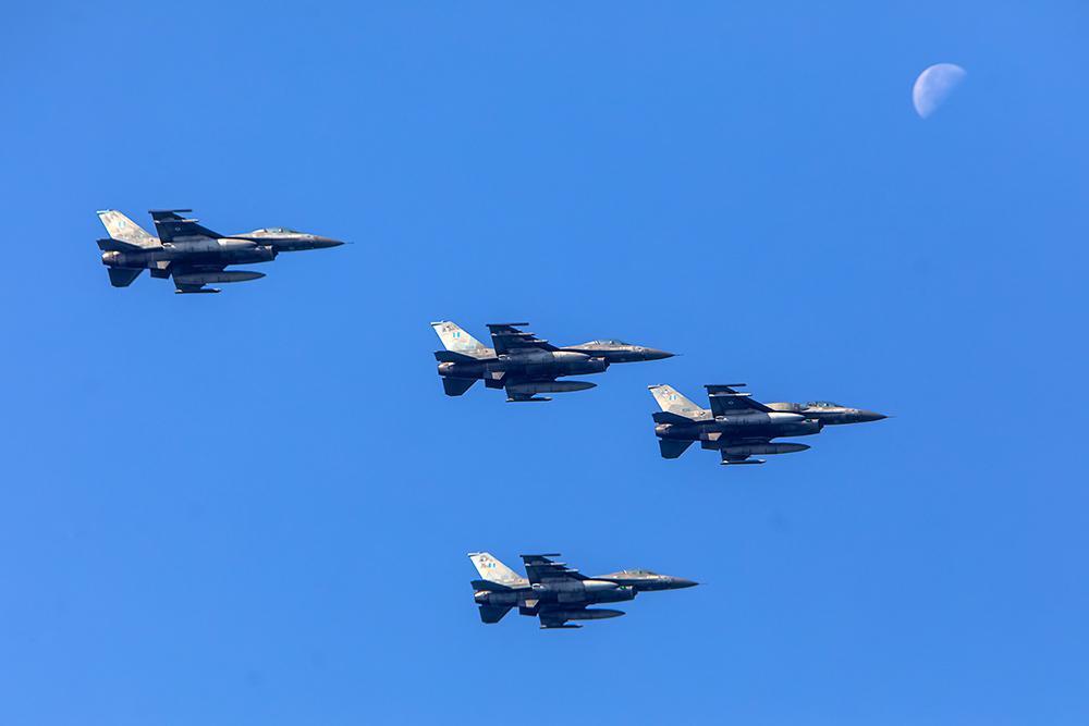 Το αεροσκάφος F-16 εκτέλεσε κατακόρυφους ακροβατικούς ελιγμούς πάνω από το λιμάνι της Θεσσαλονίκης αλλά και διελεύσεις με μεγάλη ταχύτητα πάνω από την πόλη.