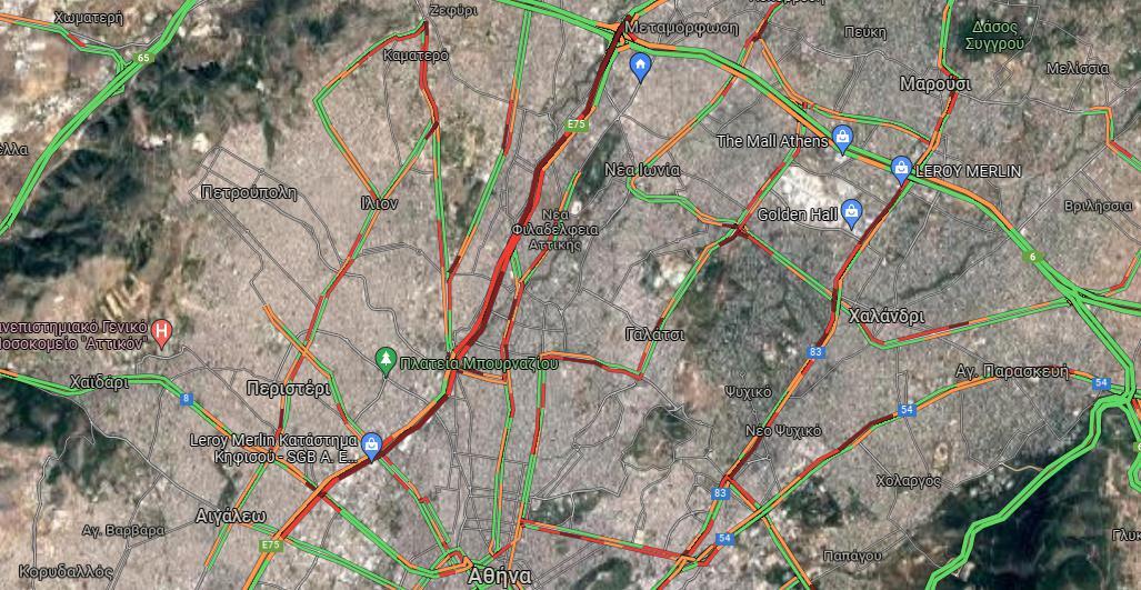 Την ίδια ώρα η κίνηση στην άνοδο ξεκινά από το ύψος του Αιγάλεω και φτάνει μέχρι την Νέα Φιλαδέλφεια.