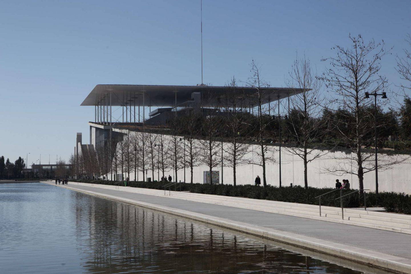 Το εξωτερικό σκηνικό έρχεται σε αντίθεση με τα ολοκαίνουργια κτίρια της Εθνικής Λυρικής Σκηνής και της Εθνικής Βιβλιοθήκης. Όπως είναι τώρα μάλλον θα ταίριαζε στις παρατημένες ολυμπιακές εγκαταστάσεις της περιοχής παρά στο ΚΠΙΣΝ που κόστισε 600 εκ. ευρώ και παραδόθηκε στο ελληνικό Δημόσιο δίχως κανένα χρέος.