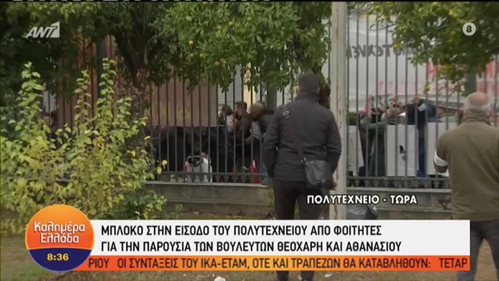 Σύμφωνα με τον ΑΝΤ1 ομάδα ατόμων, πιθανότατα φοιτητές, αντέδρασαν στην παρουσία του κ. Θεοχάρη και του κ. Αθανασίου. Μάλιστα πήραν το στεφάνι και το απομάκρυναν από την είσοδο.